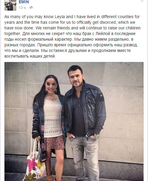 Leyla xanımın açıqlamasından sonra Emin bəy də məsələyə aydınlıq gətirib. O da ayrı şəhərlərdə yaşadıqlarını əsas gətirərək boşanma qərarını birlikdə verdiklərini yazıb: "Mənim səyahətlərim çox olur, biz ayrı şəhərlərdə yaşayırıq, oğullarım Bakıda, anası ilə birlikdə yaşayır. Çoxları üçün sirr deyil ki, son illər bizim Leyla isə nikahımız formal xarakter daşıyırdı. Biz çoxdan müxtəlif şəhərlərdə, ayrı yaşayırdıq. Boşanmamızı rəsmiləşdirməyin vaxtı gəlib çatdı və biz bunu etdik. Biz dost olaraq qalırıq və uşaqlarımızı birlikdə tərbiyə etməkdə davam edəcəyik".