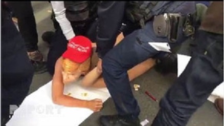 Bir neçə nəfərin iştirak etdiyi etiraz aksiyasının özünəməxsusluğu etirazçıların bədənlərinə «Team Marine» - "Marinin komandası" sözlərini yazmaları, habelə ABŞ prezidenti Donald Tramp və Rusiya prezidenti Vladimir Putinin maskalarını geymələrindən ibarət olub.