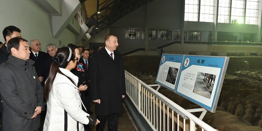 İlham Əliyevin diqqətinə çatdırılıb ki, yeraltı heykəllər ordusu 1974-cü ildə kəşf edilib və dünya tarixinin ən önəmli arxeoloji tapıntılarından hesab olunur. 1977-1985-ci illərdə burada iki dəfə arxeoloji qazıntı işləri aparılıb. Tədqiqatlar nəticəsində boyları 183 və 193 santimetr arasında dəyişən heykəl əsgərlər aşkarlanıb. Heykəllərin özəlliyi onların hər birinin üz ifadəsinin və geyimlərinin fərqli olmasıdır. Lakin tapılan heykəllər torpaqdan çıxarılandan sonra üzlərindəki boyalar pozulduğuna və təbii rənglərini dəyişdiyinə görə arxeoloqlar qazıntı işlərini yarımçıq qoymağa məcbur olublar. Çinlilər tərəfindən dünyanın səkkizinci möcüzəsi kimi qəbul edilən terrakota əsgərləri ilə bağlı qazıntı işləri texnikanın və elmin inkişafı nəticəsində 2009-cu ildə yenidən bərpa olunub. Qazıntı aparılan ərazidən indiyədək təxminən iki min əsgər heykəli tapılıb. Ərazidə 520 atla 8 min əsgərin, 130 döyüş arabasının, 150 süvarinin olduğu təxmin edilir. Onlar 600-ə yaxın yeraltı çuxurda toplanıb. Çin imperatoru Sin Şi Huangın məzarı da buradadır. Əfsanəyə görə, terrakota ordusu imperator Sin Şi Huangın məzarını qoruyurmuş.