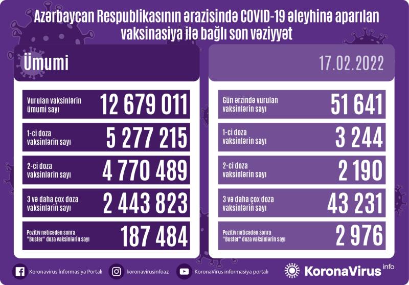 Nazirlər Kabineti yanında Operativ Qərargah 17.02.2022 tarixi üçün COVİD-19 infeksiyasına yoluxma, aparılan testlər , vaksinasiya və ölüm statistikasını açıqlayıb.