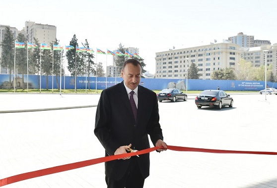 Prezident İlham Əliyev binanın rəmzi açılışını bildirən lenti kəsdi.