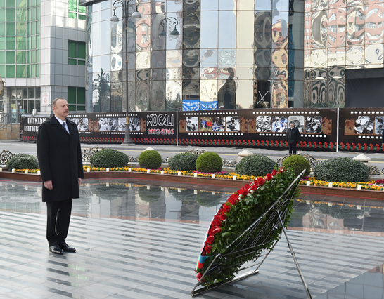 Prezident İlham Əliyev abidənin önünə əklil qoydu, faciə qurbanlarının xatirəsinə ehtiramını bildirdi.